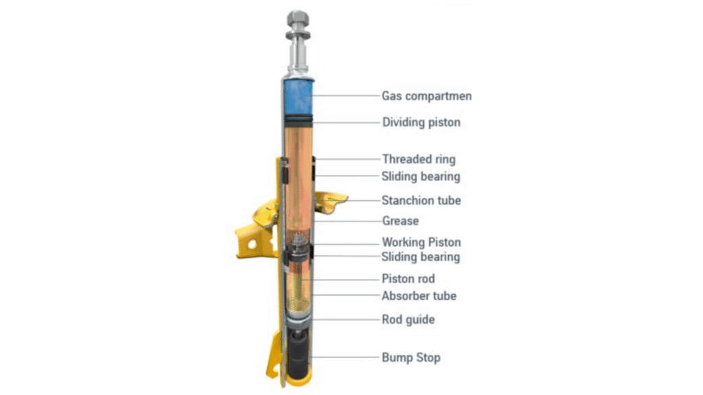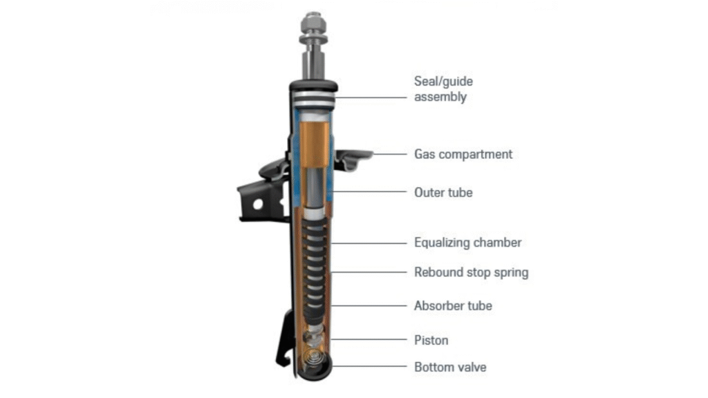 Twin-Tube Strut Structure Alt: Illustration of twin-tube strut shock absorber with labeled parts.