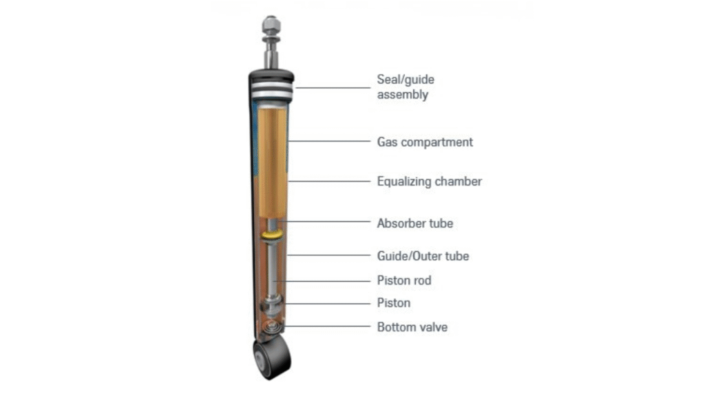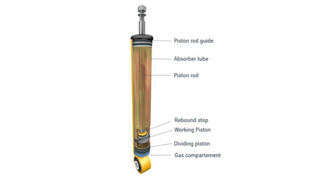 Mono-Tube Absorber Structure Alt: Labeled mono-tube shock absorber for high-performance vehicles.
