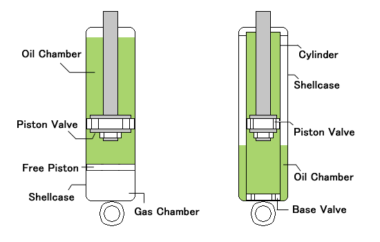 | Structure | Inner & outer tubes + bottom valve | Single tube + floating piston |